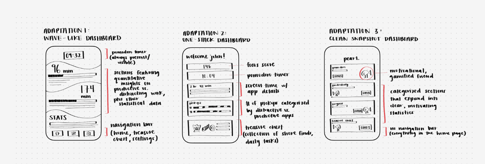 We ended up going with Adaptation 3, where we removed all the extra boxes and grouped them into folders to make the homepage feel cleaner and more welcoming. This version breaks the user’s priorities into four main categories: Pomodoro, Productivity, Progress, and Treasure Chest. Inside each section, users can tweak things like timer length or daily tasks, just enough customization to keep them engaged without pulling them off track. We refined a preliminary information architecture that our app will be based off on.